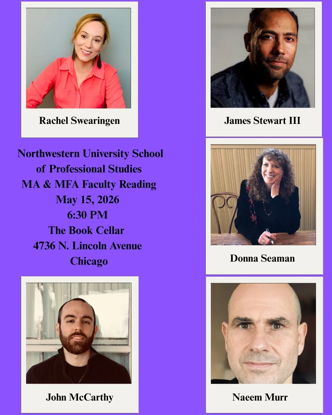 Please save the date for an in-person reading at 6:30 PM CT, May 15, at the Book Cellar in Lincoln Square, Chicago with 5 our prose and poetry faculty: Rachel Swearingen, Naeem Murr, John McCarthy, James Stewart, and Donna Seaman.